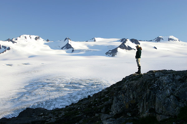 Heather looking out on the Exit Glacier and the Harding Ice Field