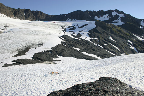 Our tent under a cirque at the top of the Harding Ice Field Trail