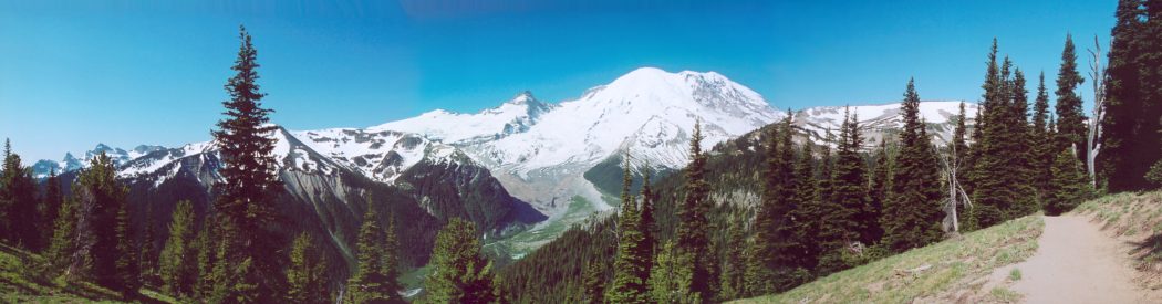 July 4, 2003. 3-photo panorama of Mount Rainier, between Sunrise Visitor Center and Sunrise Camp.