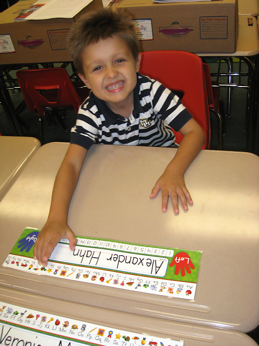 Alex at his desk at kindergarten orientation.