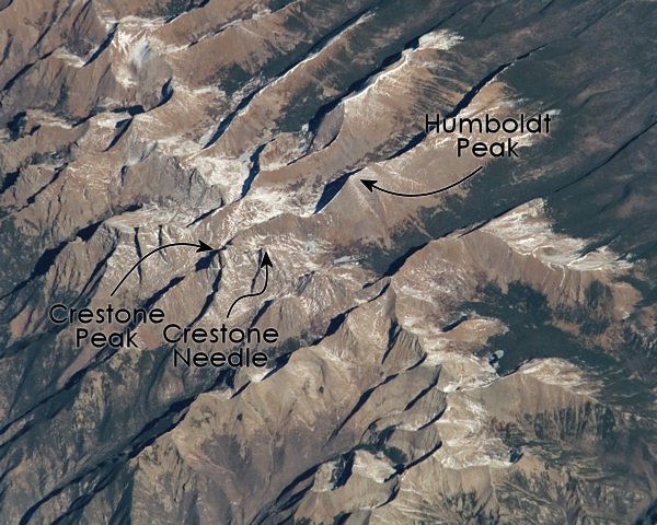 Humboldt Peak from the International Space Station. Image credit: Image Science and Analysis Laboratory, NASA-Johnson Space Center. "The Gateway to Astronaut Photography of Earth."