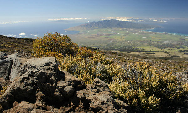 The West Maui Mountains and the Maui Isthmus as seen from the top of Haleakala. Lana'i and Moloka'i can been seen behind the West Maui Mountains.