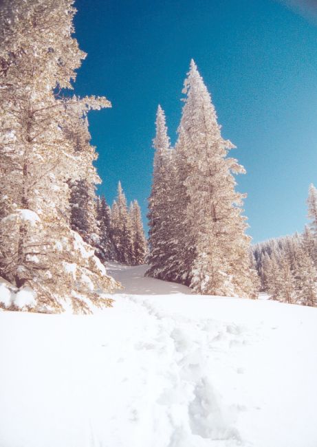 Deep snow after the snowstorm on Bull-of-the-Woods Trail two days later, elev. about 10560', March 2001