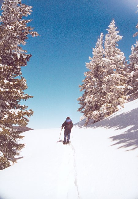 Heading back after encountering deep snow below Bull-of-the-Woods Mountain, March 2001