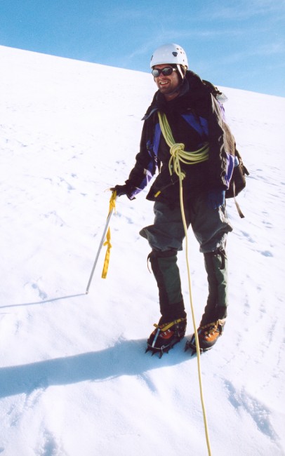 Todd in full mountaineering gear on summit day. Rope, Kiwi-coil, ice-axe, helmet, crampons,... the whole bit.