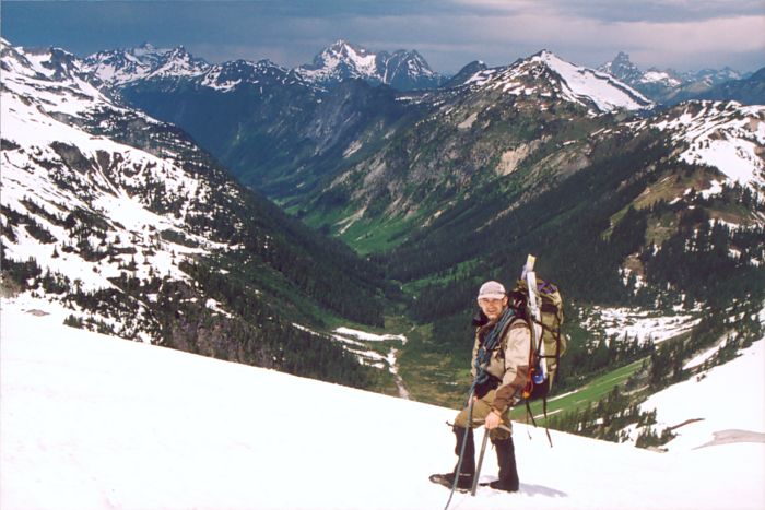 Todd with Ruth Creek Valley in the background. We hiked all the way up this valley, to Hannegan Pass, and up to Ruth Mountain--and all the way back down--in 13 hours.
