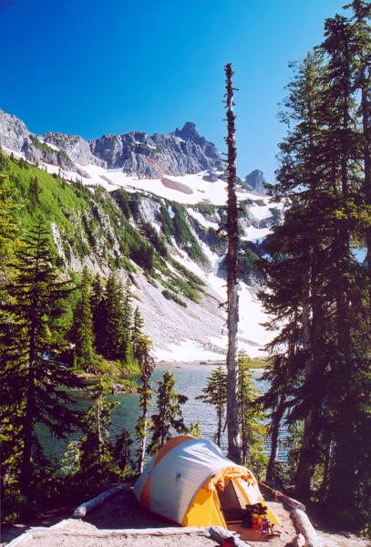 Our tent, Snow Lake, and Unicorn Peak.