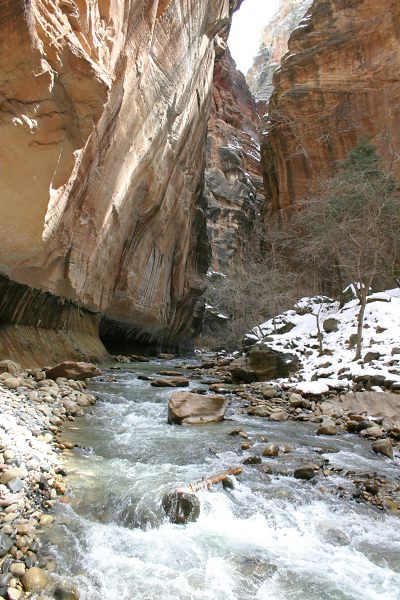 The Zion Narrows, March 16, 2006. The Virgin River was running at a mild 75 cubic feet per second, allowing fairly easy passage up the canyon.