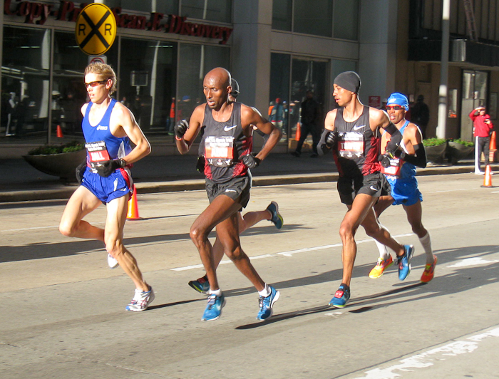 Here is one of my photos of Ryan Hall, Abdi Abdirahman, Dathan Ritzenhein (hidden), Mohamed Trafeh, and Meb Keflezighi early in the Olympic Marathon Trials in Houston this morning.