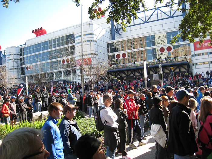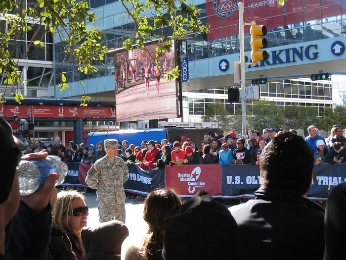 Desiree Davila, Shalane Flanagan, Kara Goucher, Deena Kastor (!), Amy Hastings, and a handful of others early in the Women's race. There were lots of people downtown watching -- a good turnout I thought -- many were probably out-of-towners running the Houston marathon (regular edition) tomorrow. The Olympic trials course today was a great course for spectators. It consisted of several loops -- and if you were on the right spot in the course, you had eight chances to see the athletes in each race.