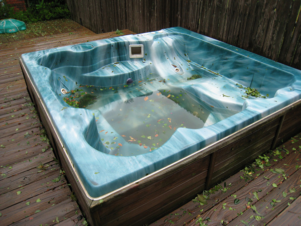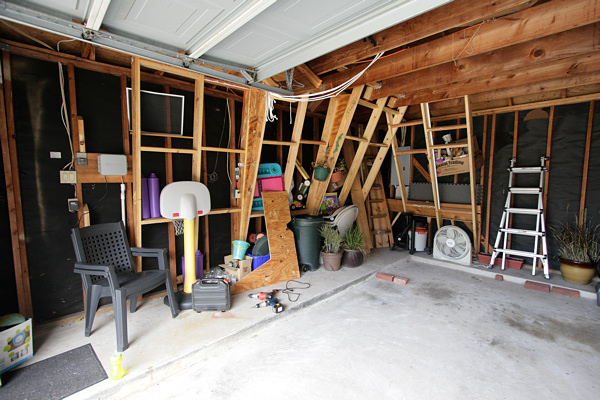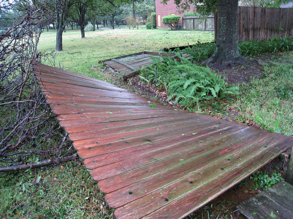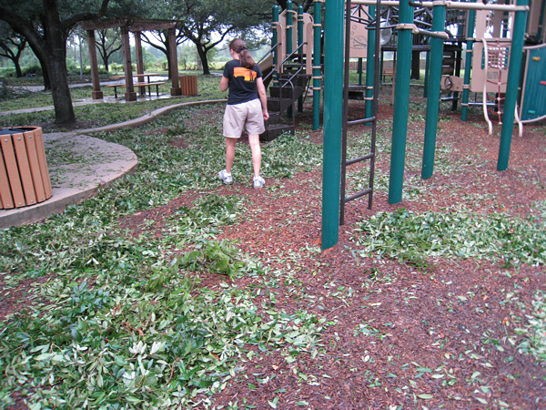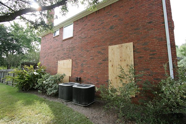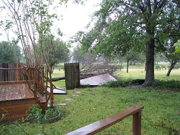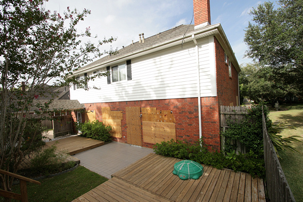 Boards on the east side windows and the backyard cleared. Fortunately, I already had boards marked and cut to fit from our Rita preparations in 2005. We cannibalized our climbing wall in our garage to cover up some of our windows in 2005. Most of the boards can be put back on the climbing wall and have climbing holds reattached via bolts.