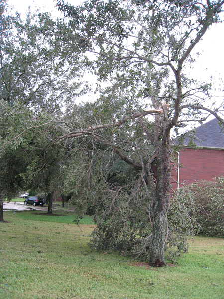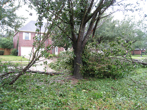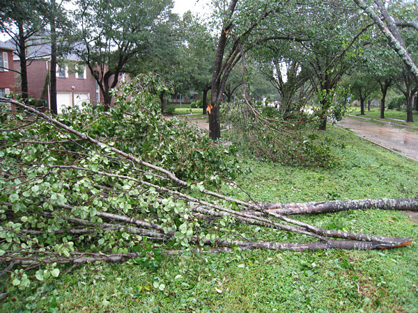 Downed Bradford Pear trees and downed limbs from Live Oaks on the west side of the intersection at Three Rivers and Riverbend Crossing.