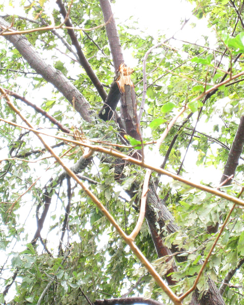 Snapped Hackberry trees along the canal between Nails Creek and Medio River.