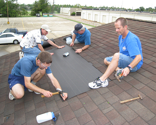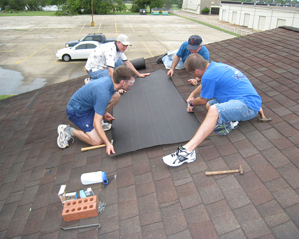 Myron Brown, Pastor Rich Wolf, and Sam Maultsby repair a section of roof where shingles were blown off at New Hope Lutheran Church.