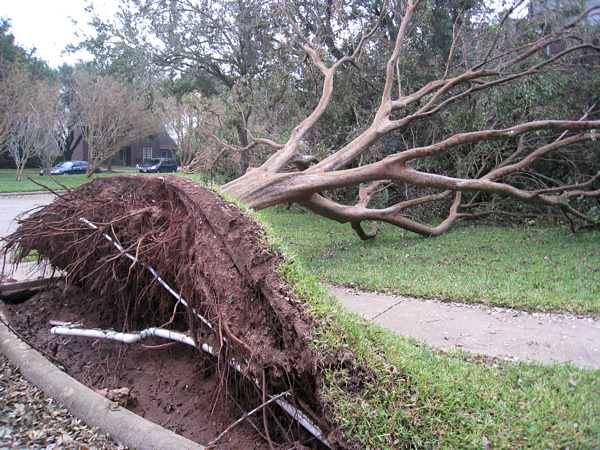 An uprooted tree that nearly hit a house at the corner of Sugar Crossing and Alice Drive, near Lexington Boulevard.