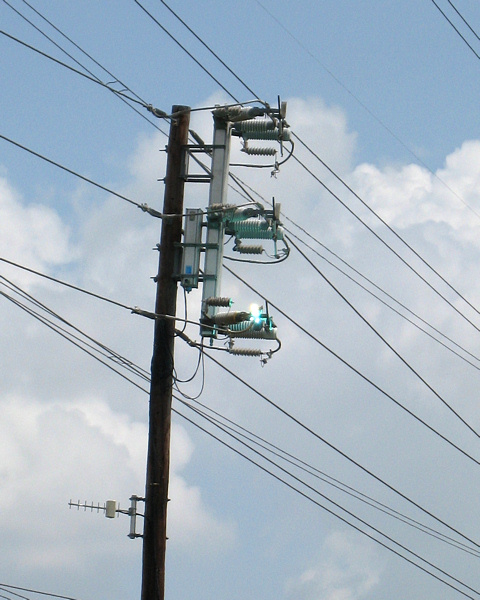 Note arcing line (look for the blue light). This was too bright to look at. This occurred when turning on the power to our subdivision. They shut the power back off for a couple of hours to fix this. I have video of this and intend to eventually post it.
