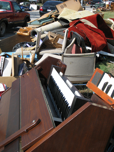Volunteers remove Zion Lutheran Church's organ console and place it on the curb to be hauled away. Volunteers gutted the church and adjoining buildings. Water rose to about four feet in the buildings.
