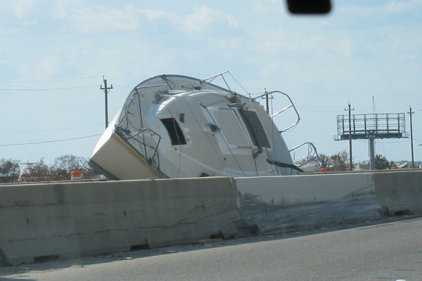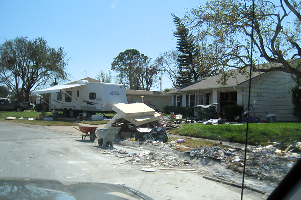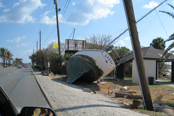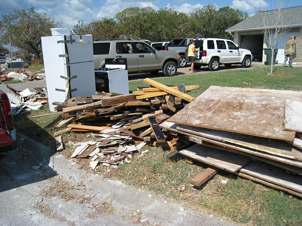 There were fragmented and mashed gypsum board on the street, on the curb, and in people's yards. Trash piles everywhere. Appliances, mattresses, furniture, clothes. Boats strewn along Highway 45 coming into Galveston. The air had a musty, fishy smell that was actually pretty mild, but only because the breeze was blowing. In some of the houses, the smell was worse. In others it wasn't bad at all. In every house, mold could be seen everywhere.