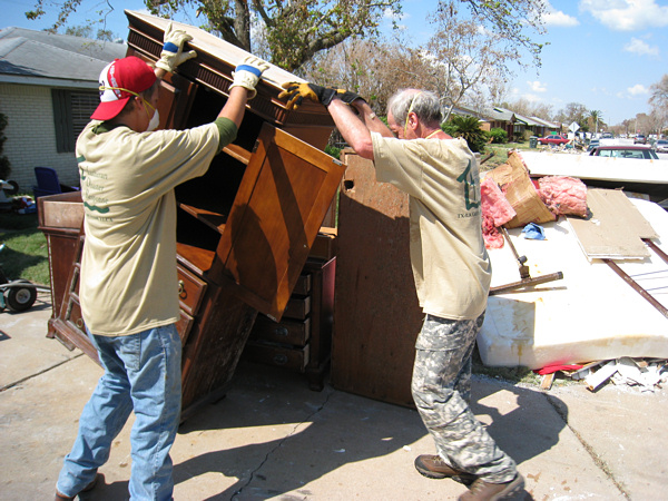 Helping clean up the outside of our first house, owned by a congregant of Zion. We couldn't help on the inside of the house for various reasons. I heard that the house hadn't been entered or opened since the hurricane. It was apparent that this house had almost four feet of water in it during the hurricane.