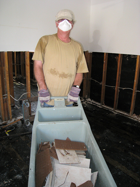 They had a nice tile floor in their dining room and kitchen. It had to go. There was soaked wood underneath. Sledgehammers and wrecking bars.