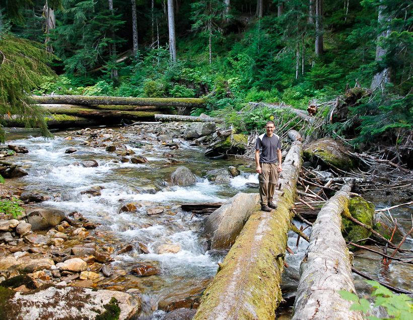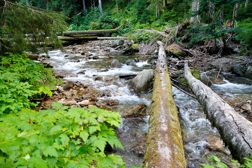 Log crossing the North Fork of the Sauk River where the Pilot Ridge trail meets the river.