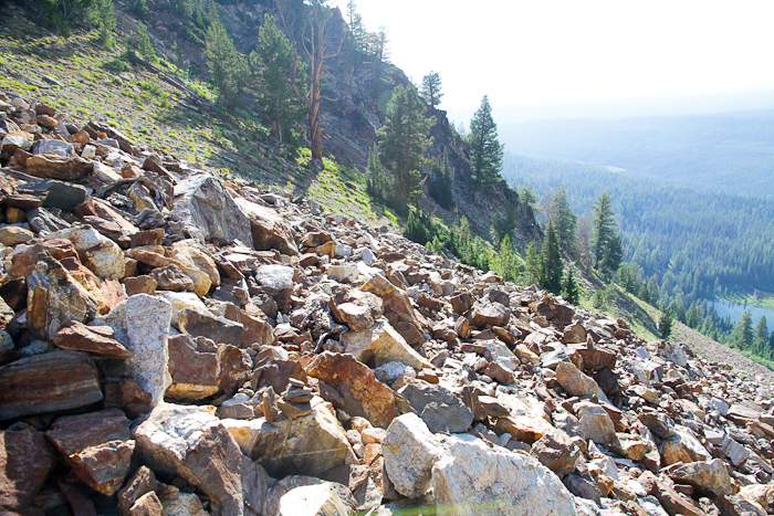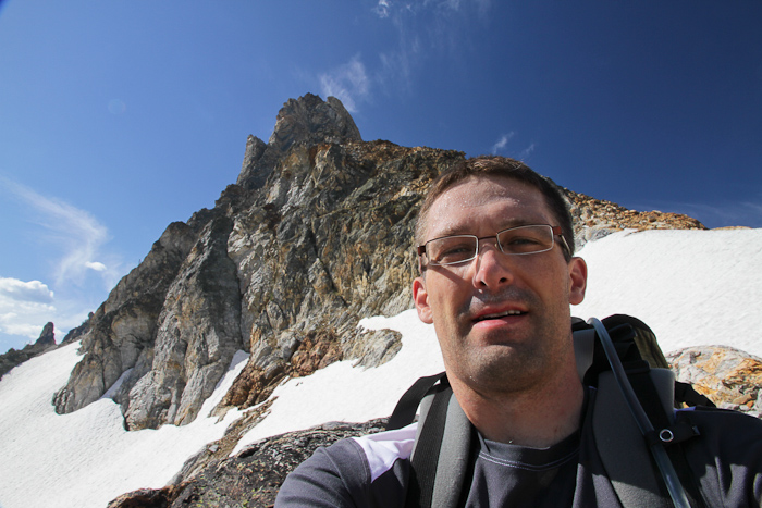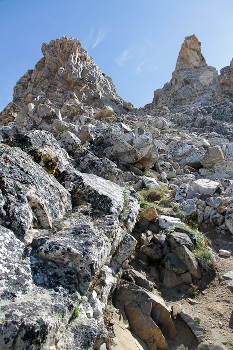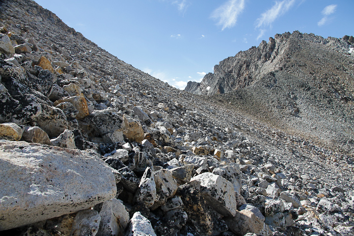 I felt that the terrian near the top this climb was brutal. There is a lot of talus that has to be traversed and climbed. There is no trail in the cirque after the first half-mile or so. The summit pyramid is a steep slope of never-ending loose talus of all sizes. Really gruelling to get up.