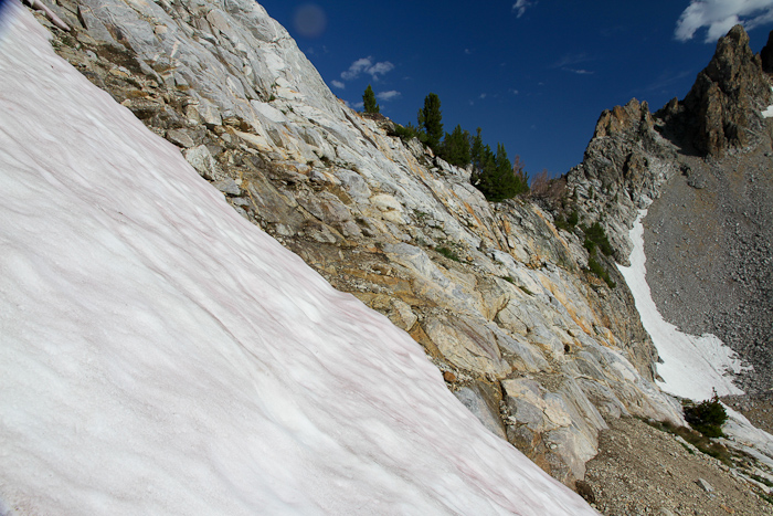 A panorama of the headwall and the snowslope leading up to the headwall. It took me 20 minutes or so to cross the soft snowslope as I didn't have and ice axe for self-arrest and had to kick steps to lessen the chance of a fall. I think a fall here wouldn't have been serious -- I was just being cautious.
