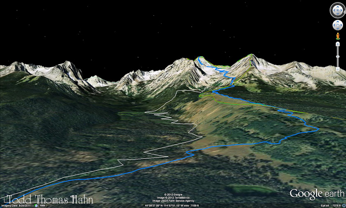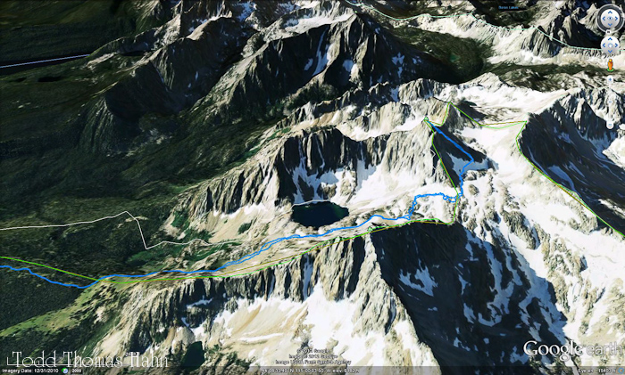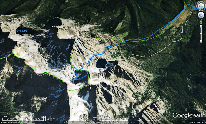 At a bit past this point (not shown), the route traverses a steep (40-45 degree) slope and the trail is narrow and loose. Heather decided she was too uncomfortable and wanted to turn around. So we swapped provisions and I gave her the keys to the rental car. She made her way to Marshall Lake and then back to the car.