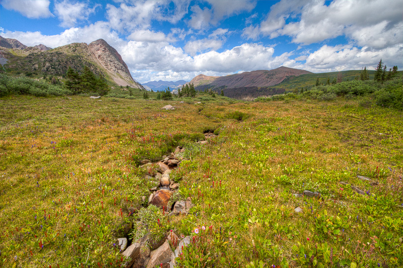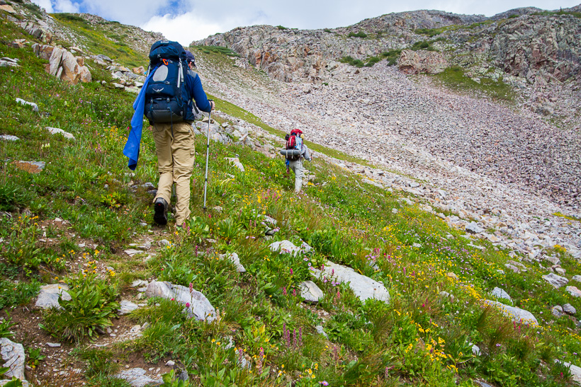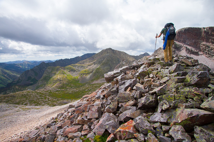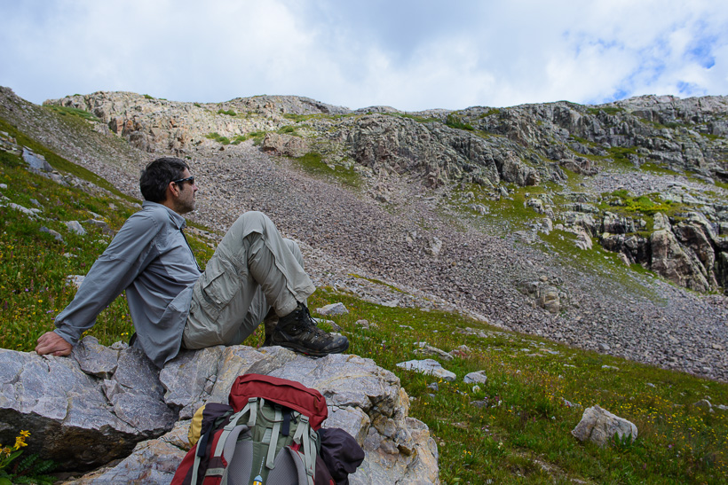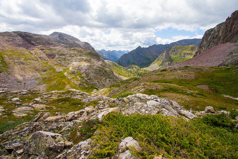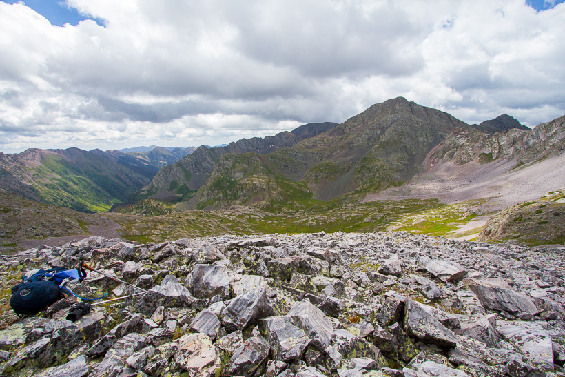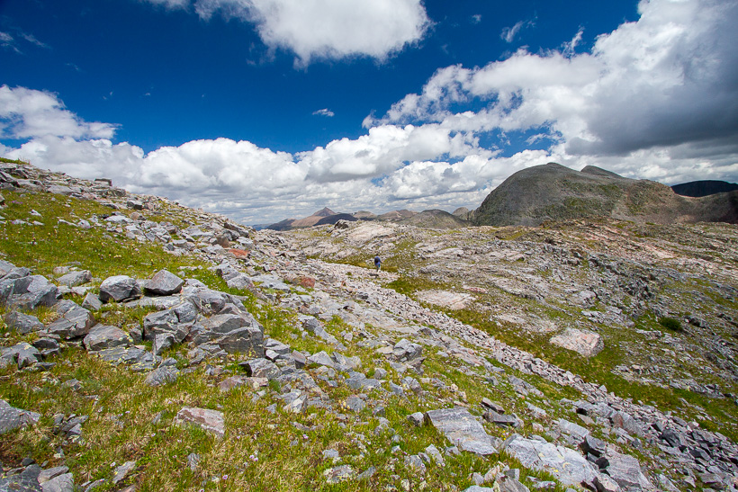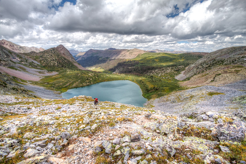 High above Moon Lake (center of photo) and Half Moon lake (not in picture). The saddle between Half Moon Lake and Rock Lake is at approximately 12,500'.