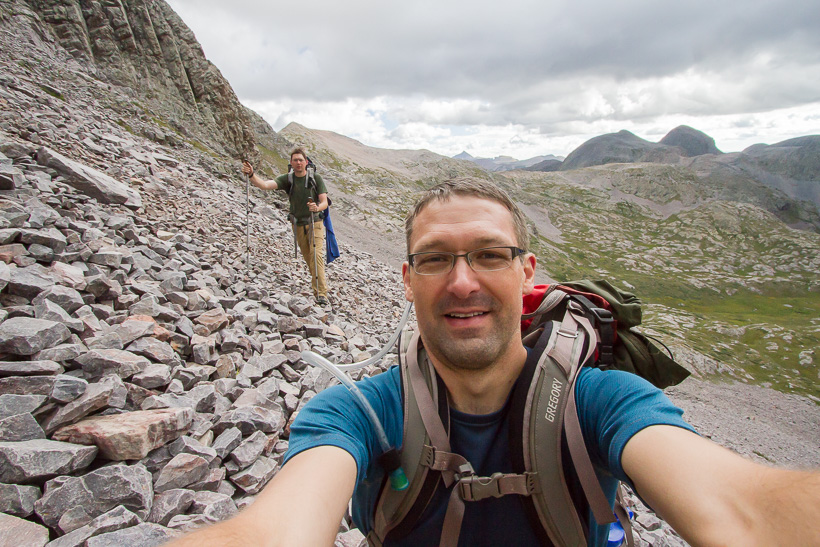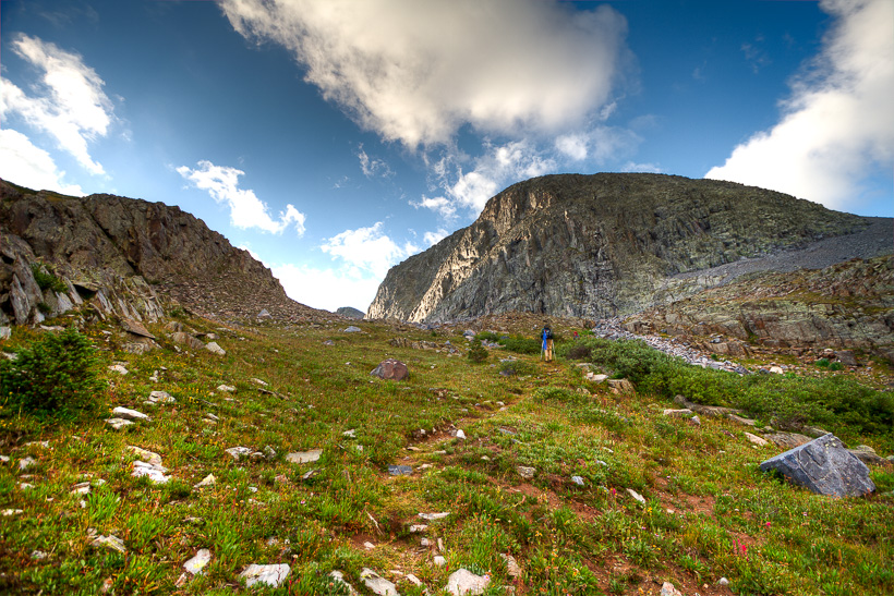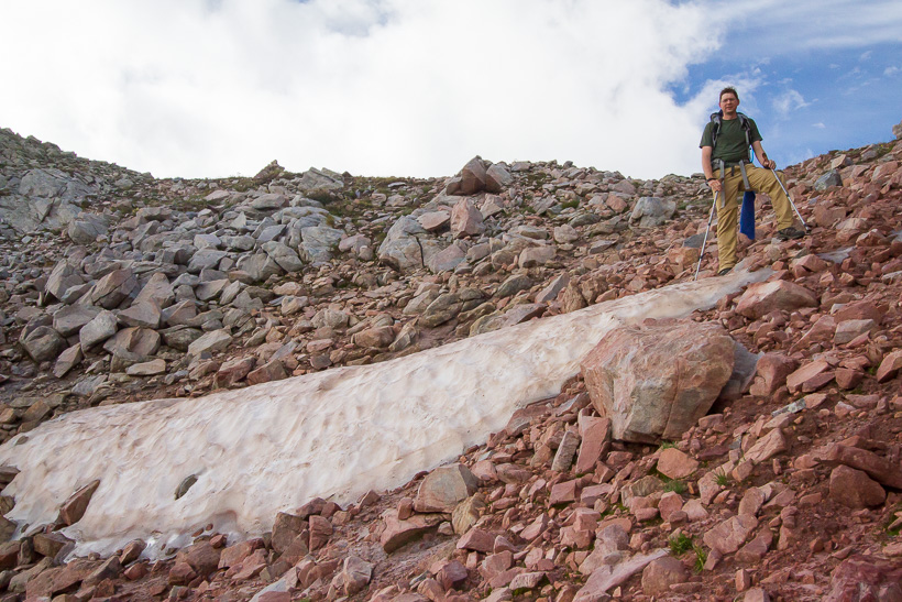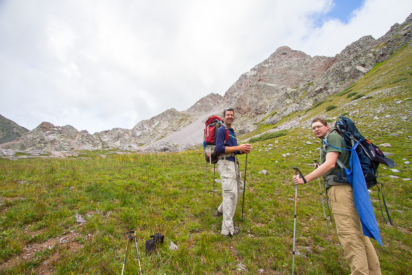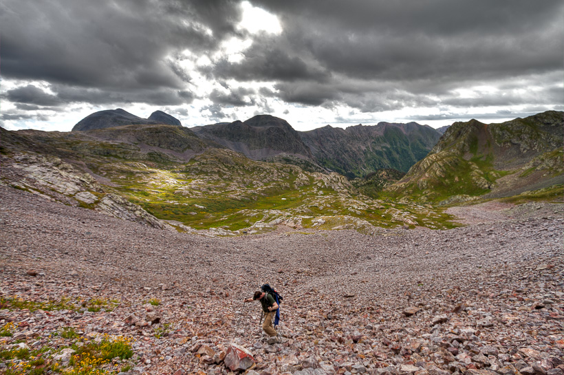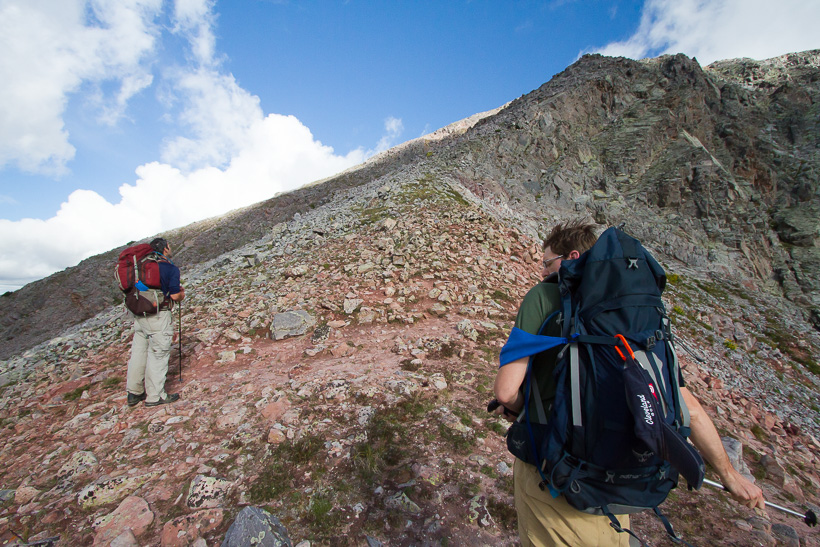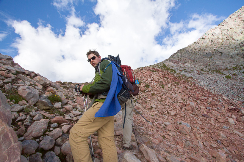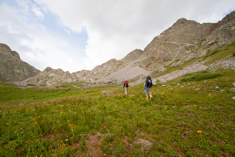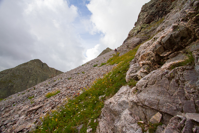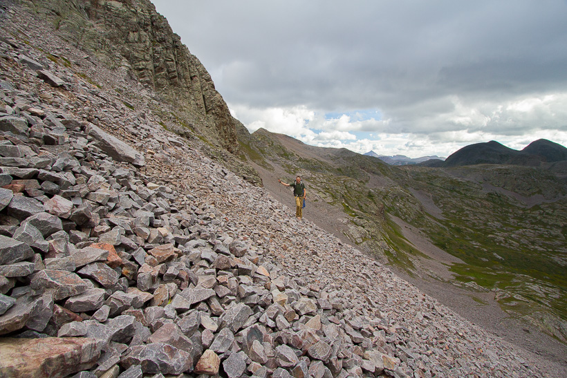 On the way to the talus slope. Our route is right above Alan, with the red backpack.