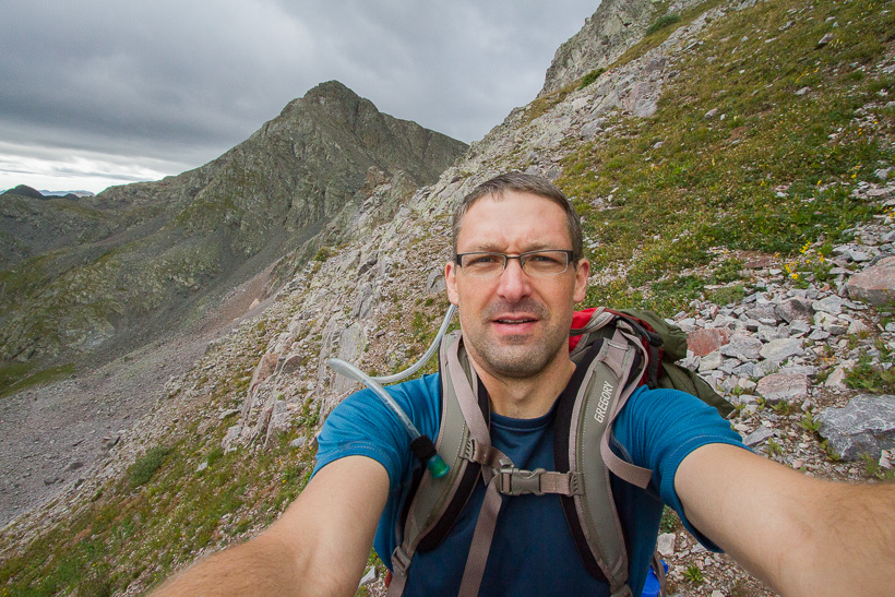 Cody at the top of the most feasible gully on the east facing side of Mount Oso's south ridge