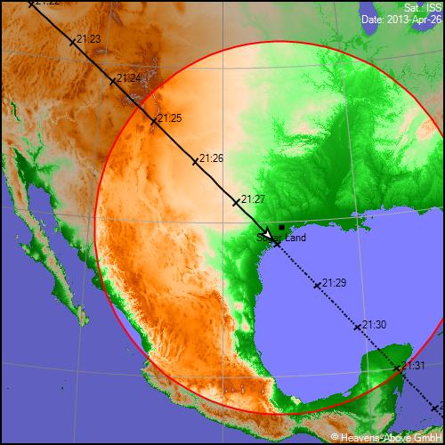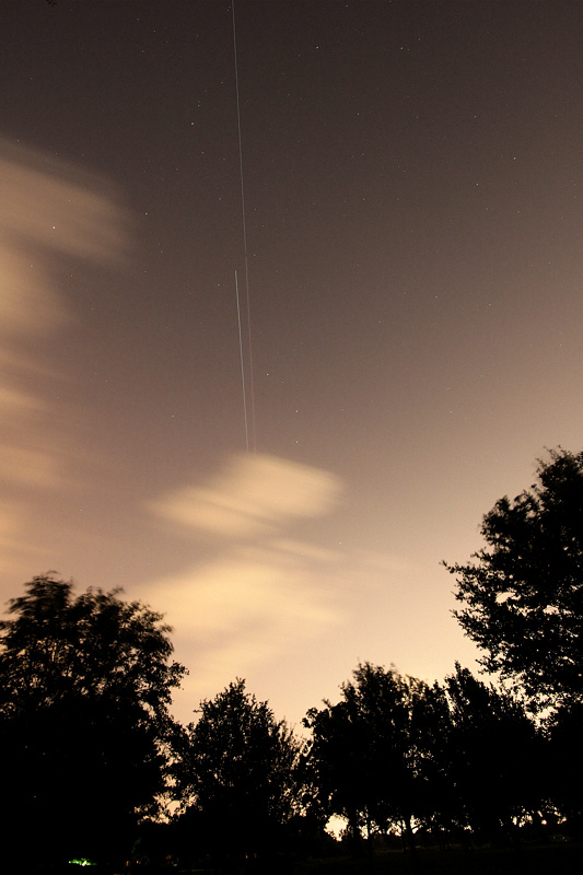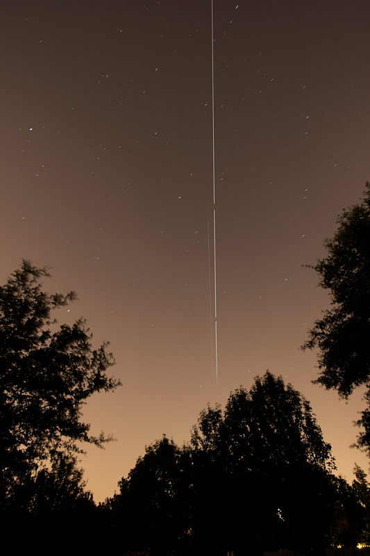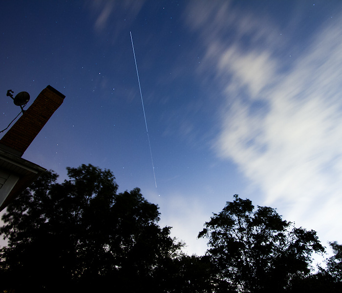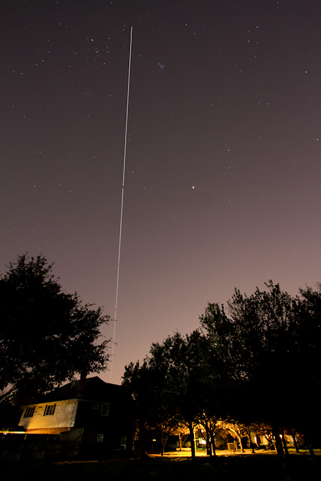 The International Space Station as seen from Sugar Land, Texas on April 13th. This image is a layering of five, 30 second exposures taken with a Canon 30D at ISO 500, f/5.6 with a 10-22mm lens. The top of the image is close to the zenith. The left side of the image is west and the right side of the image is northwest. The slight flare at the top of the image is from the moon.