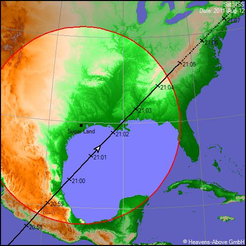 A combination of four 30-second exposures of the International Space Station as seen from Sugar Land, Texas at around 7:37 CST. Taken with a Canon 30D at ISO 400, f/5.6 with a 10-22mm lens. The right side of the image is looking west and the left side of the image is looking south.